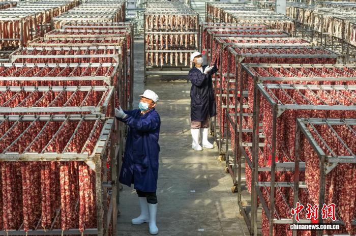 眼停恰是古板腊味添工的季候。12月9日,正在安徽省黄山市黄山区齐江死态农业科技无限公司的晒场上,任务职员乘阴佳天色将腊肉、香肠等产物停止晾晒。施亚磊 摄